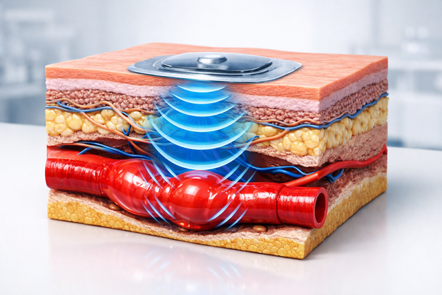 잠수함이 음파로 바닷속 물체까지의 거리를 측정하듯이, 이 센서도 미세한 초음파를 혈관에 쏘아 보내서 심장 박동에 따라 변하는 혈관의 크기를 실시간으로 감지합니다.